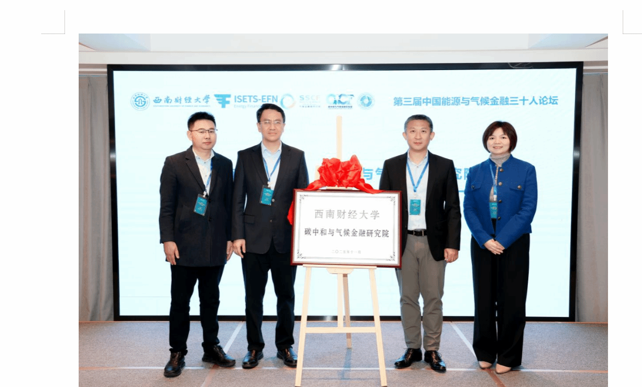 11月15日,西南财经大学碳中和与气候金融研究院正式揭牌成立,这是学校落实国家“双碳”目标、强化学科交叉融合、服务绿色发展的又一重大举措,标志着学校在气候金融领域的研究迈入新阶段。党委常委、副校长王擎出席揭牌仪式并致辞。