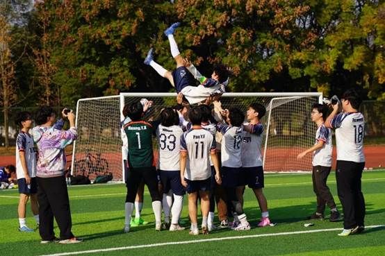 赛场上的所向披靡,离不开赛场下和谐温暖的球队氛围。在经管足球队里,没有紧绷的压力,没有互相的抱怨,只有队友间的调侃幽默与并肩前行的鼓励支持。训练结束后,大家会一起讨论技术动作、战术配合,偶尔也会用玩笑缓解训练的疲惫;比赛结束后,由队长大家一起复盘比赛,反思问题。这种 “心连心” 的团队氛围,让队员们不仅是赛场上的战友,更是生活中的伙伴,也正是这份温暖与默契,成为球队一路披荆斩棘、最终夺冠的重要力量。