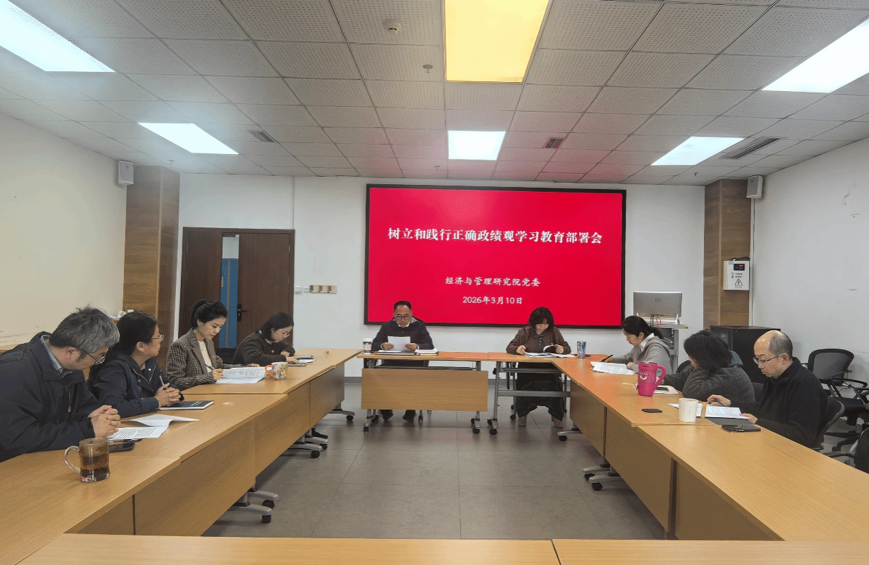 2026年3月10日,经济与管理研究院召开党委扩大会议,启动部署开展树立和践行正确政绩观学习教育。学院党委书记黄文讲话并进行工作部署,院领导班子成员、党委委员、纪委委员、科级干部等参加了此次会议,会议由执行院长董艳主持。