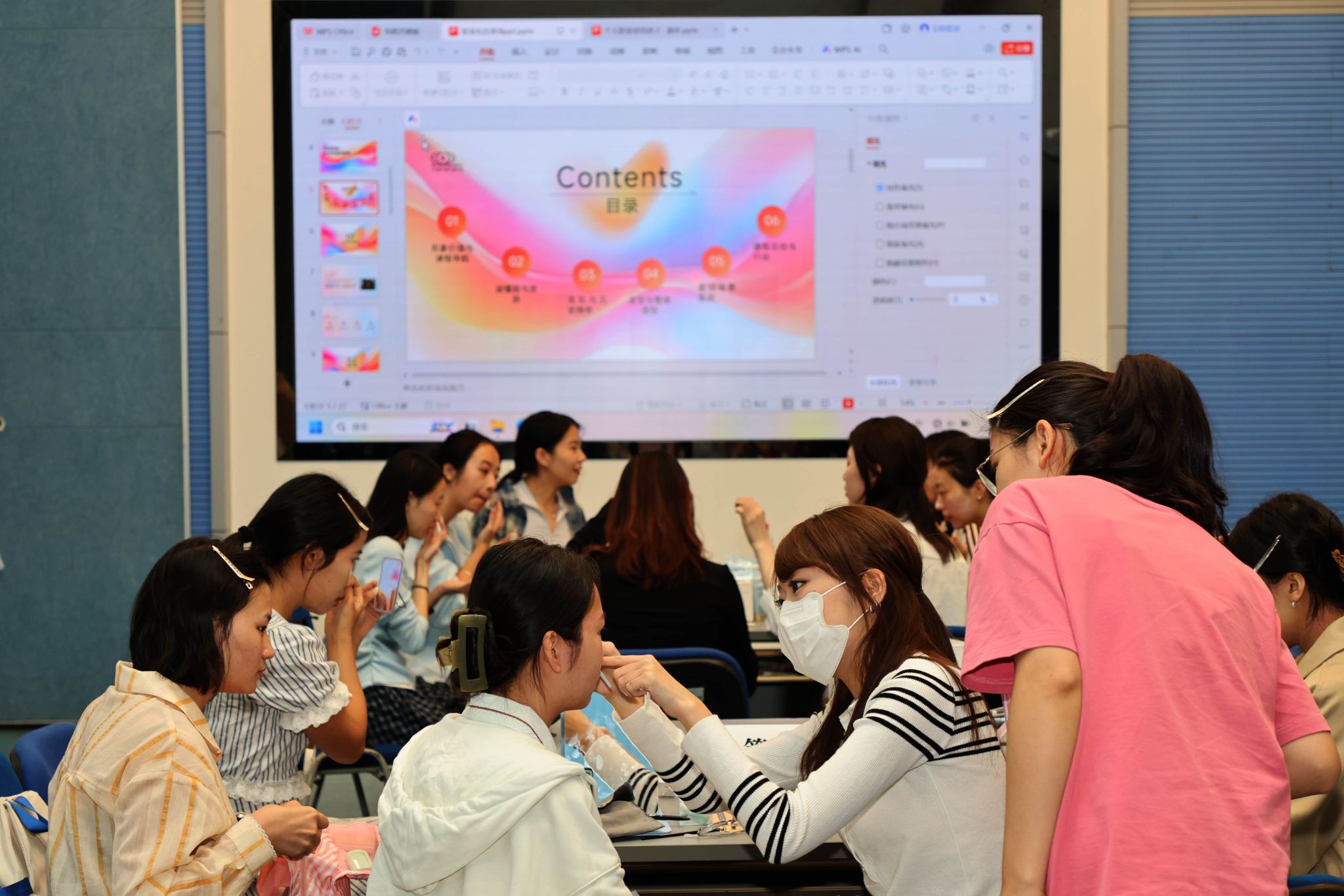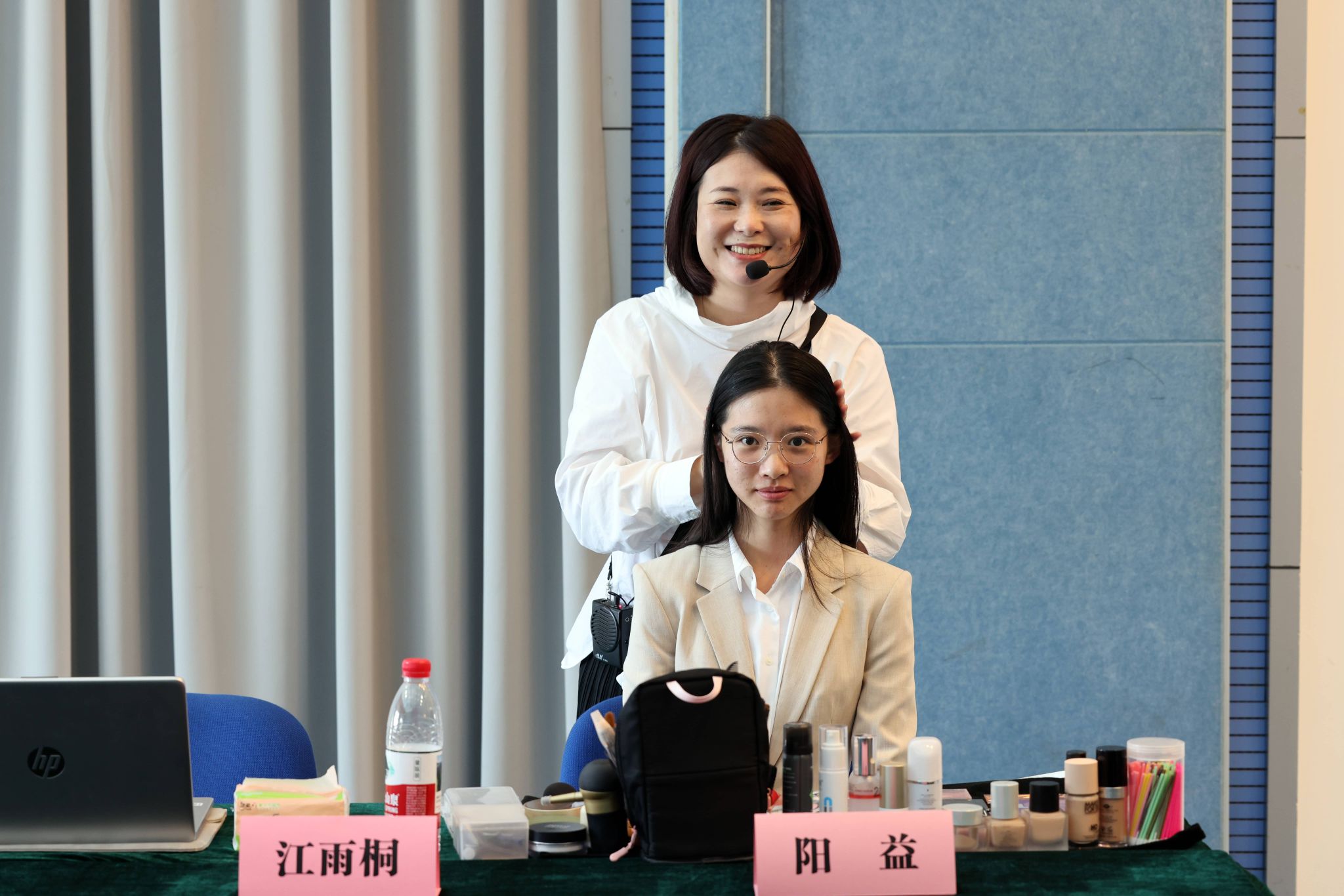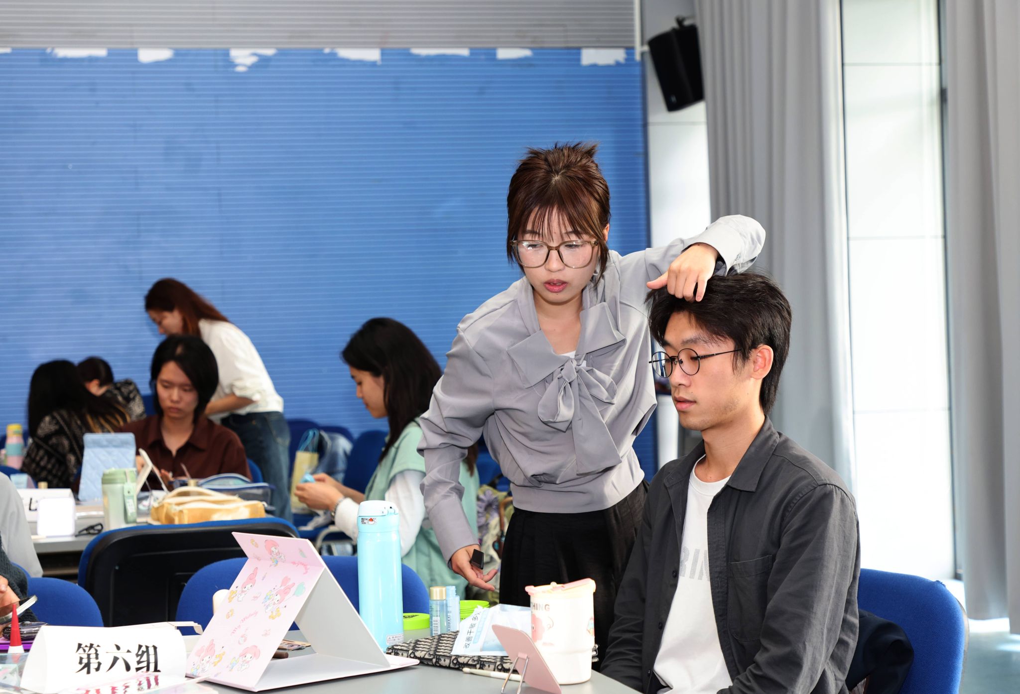 活动融合“理论讲授+现场示范+分组实操”于一体。阳益老师系统讲解职业妆容技巧,涵盖底妆、五官修饰及发型设计全流程。随后,邀请学生担任模特,现场演示职业妆造过程,直观展现形象塑造要点。在分组实操环节,同学们踊跃尝试,在导师一对一指导下深化理解,提升实际操作能力,现场互动热烈。