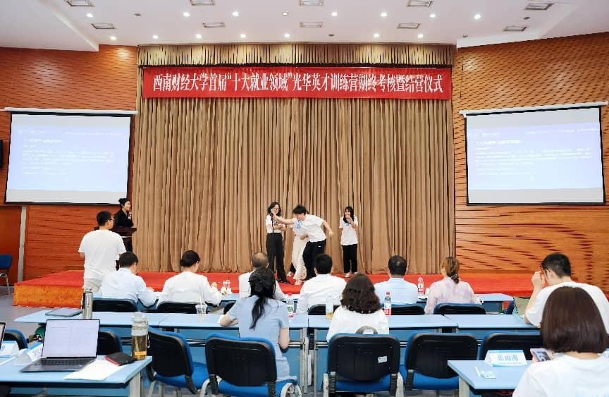 5月23日下午,西南财经大学首届“十大就业领域”光华英才训练营期终考核暨结营仪式在学生活动中心多功能会议厅隆重举行。来自乐山市商业银行、中国平安人寿保险、中信证券、南方基金企业嘉宾,西南财经大学学生职业规划与就业指导中心主任徐利军、经济与管理研究院党委书记黄文和四十名营员齐聚一堂,共同见证这一重要时刻。